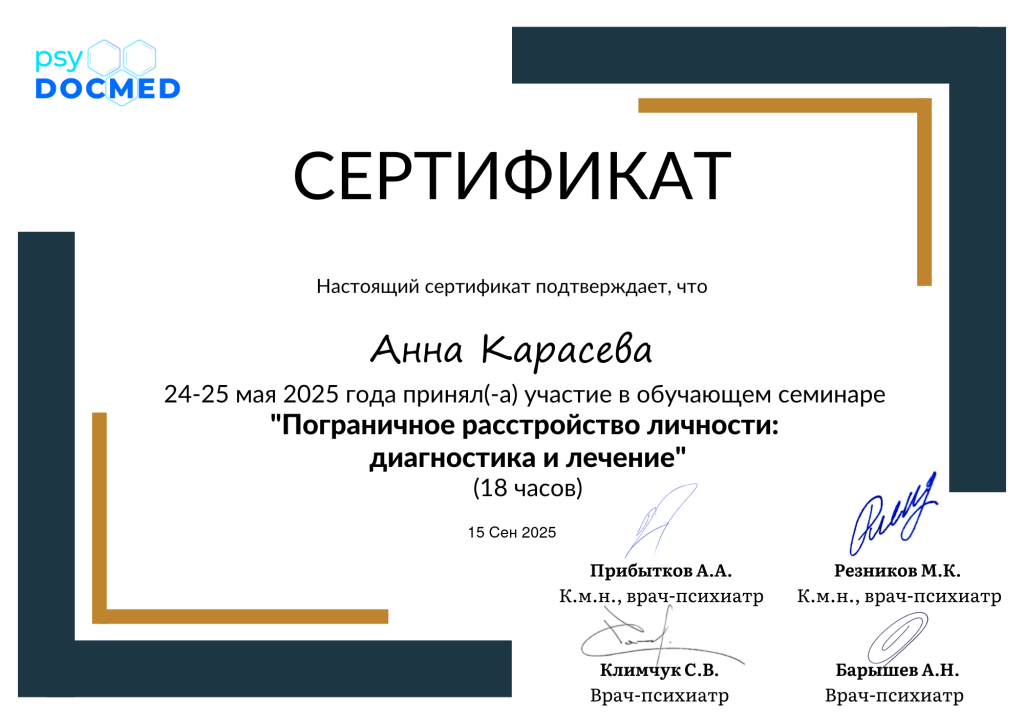 Врач-психиатр Карасева Анна Алексеевна ведет очный прием в центре «Эмпатия» по адресам: г. Москва, Проспект Вернадского, д. 15 (м. «Университет») - ЗАПИСАТЬСЯ, г. Москва, ул. Малая Семеновская, д. 10 (м. «Электрозаводская») - ЗАПИСАТЬСЯ, , также можно записаться к специалисту на онлайн-консультацию.