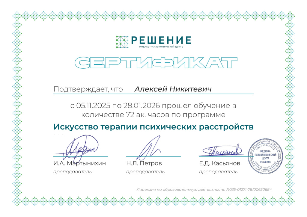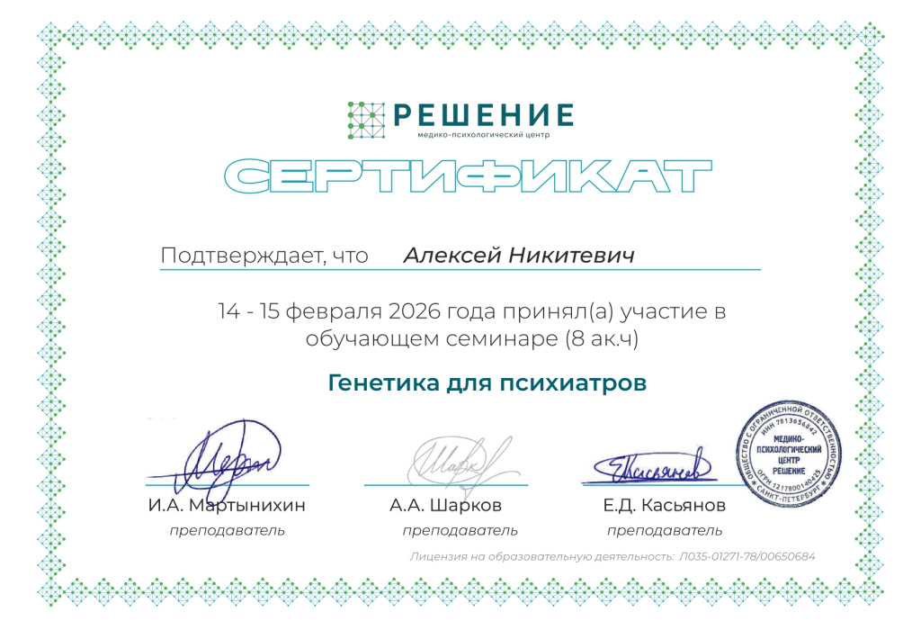 Врач-психиатр Никитевич Алексей Владимирович ведет очный прием в центре «Эмпатия» по адресу: