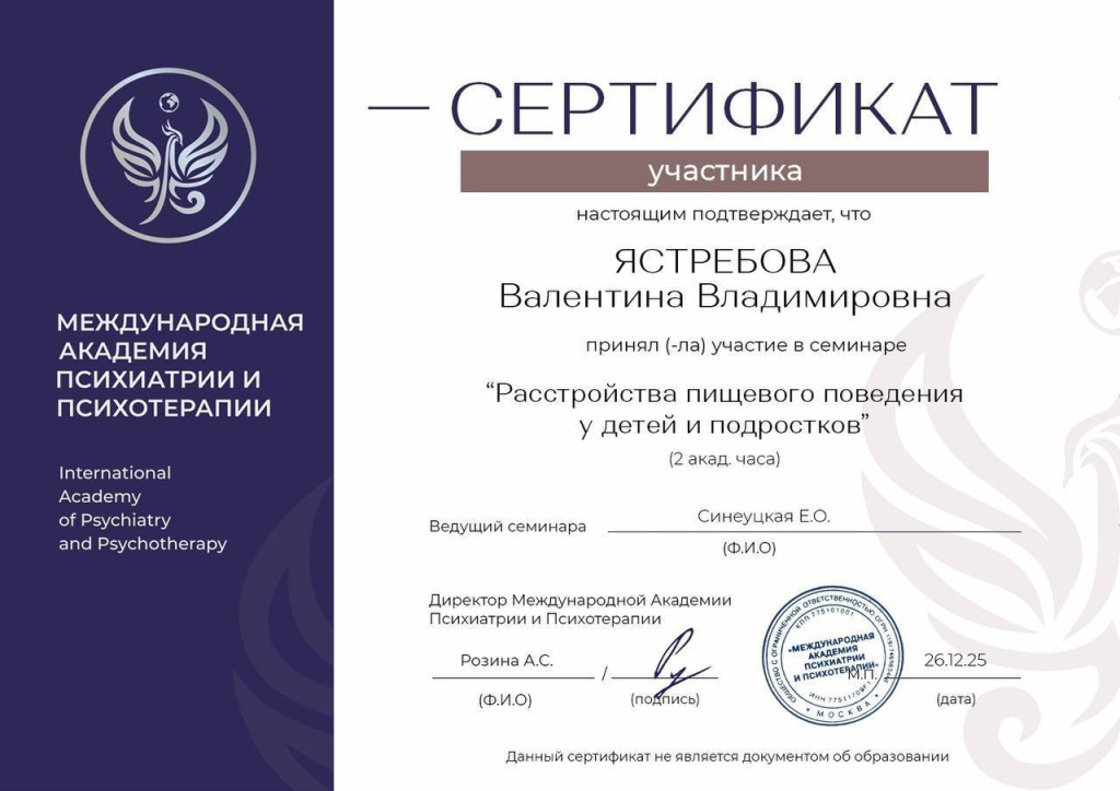 Валентина Ястребова получила базовое медицинское образование в Пироговском университете. Во время учебы проходила волонтерскую стажировку в Центре изучения расстройств пищевого поведения (ЦИРПП). Специальность врача-психиатра Валентина Ястребова получила в Сеченовском университете, окончив профильную ординатуру с отличием.