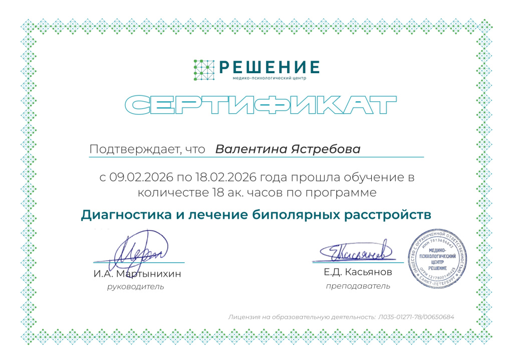 Врач-психиатр Валентина Владимировна Ястребова ставит своей задачей проведение точной диагностики ментальных расстройств с последующим лечением по современным протоколам.