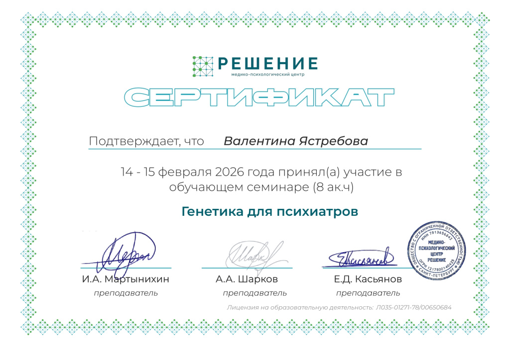Врач-психиатр Ястребова Валентина Владимировна ведет очный прием в центре «Эмпатия» по адресу:
