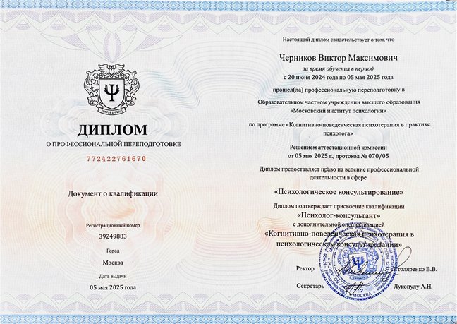 Виктор Черников с отличием окончил государственный медицинский университет в Волгограде и ординатуру по психиатрии в московском НМИЦ психиатрии и наркологии имени В.П. Сербского. Также врач прошел профессиональную переподготовку по когнитивно-поведенческой психотерапии.